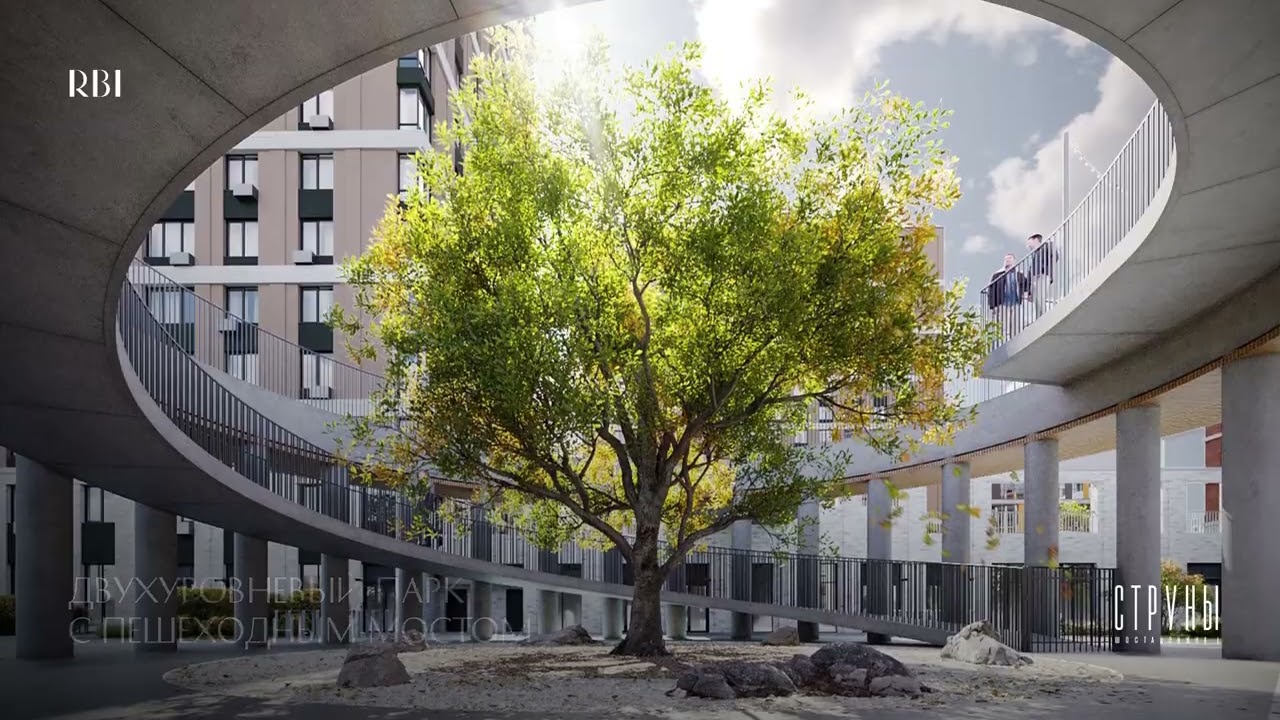 На территории, которая располагается вровень с первыми этажами комплекса, появятся кафе, магазины, парк с пешеходным бульваром.